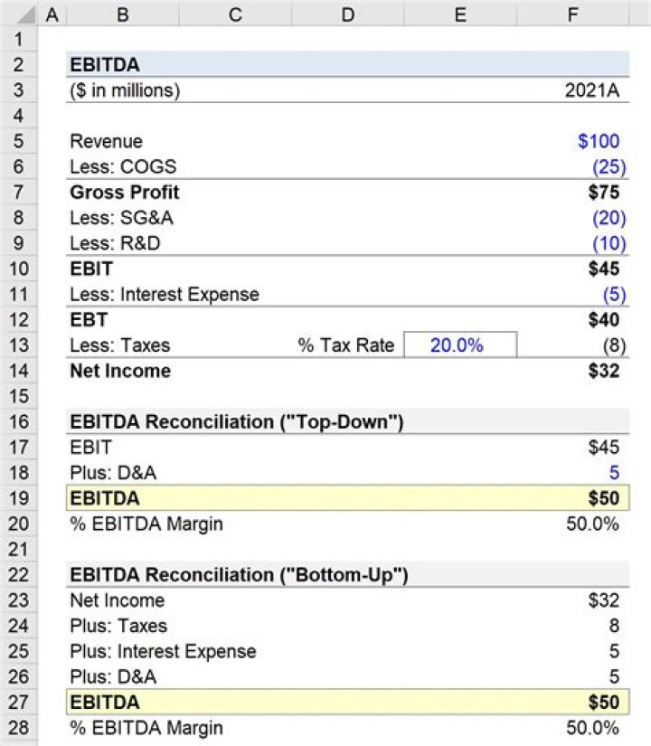 - EBITDA = Net Income + Tax Expense + Interest Expense + Depreciation & Amortization Expense.