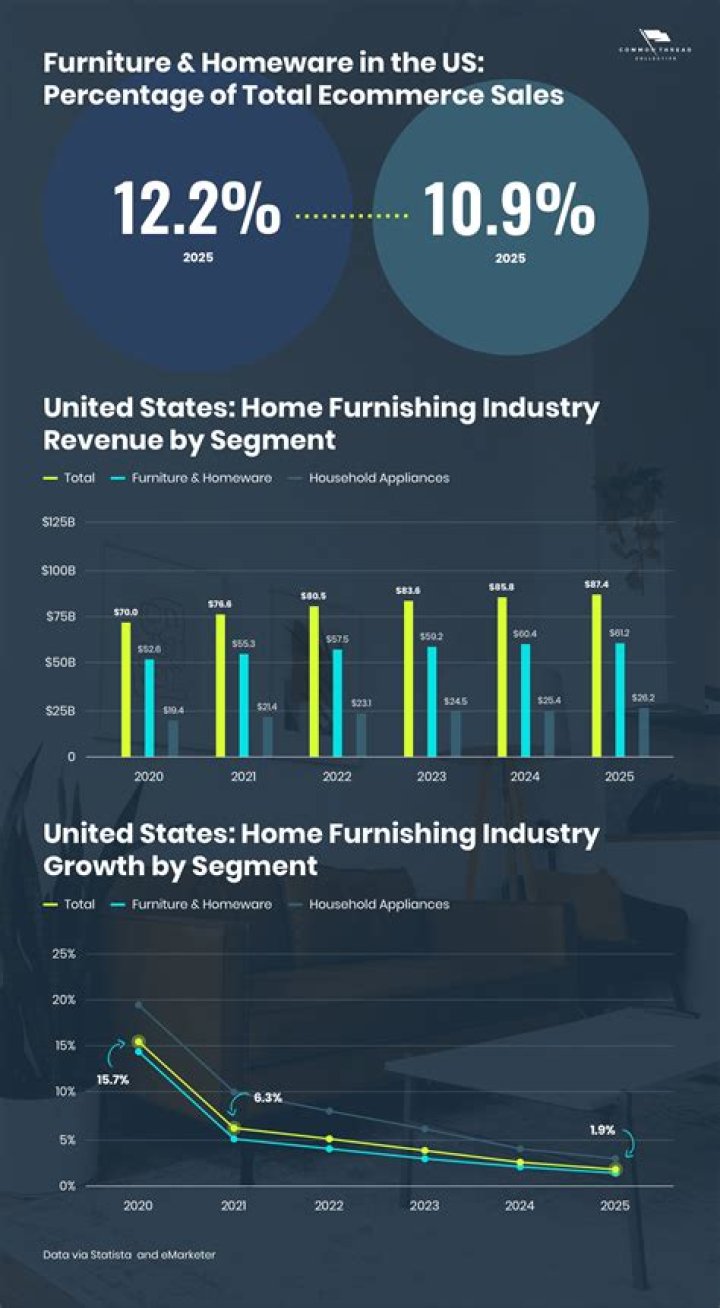 The total market size of the furniture industry, accounting for related accessories, floor coverings, and draperies operate within a $30 billion dollar industry. The value of all furniture and furnishing store sales in the United States net at $106.78 billion dollars.