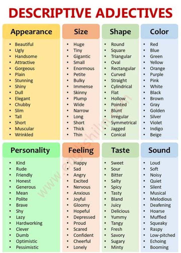 When writing descriptions, two types of descriptive words – adjectives and adverbs – can be used to make the description more specific. Figurative language is a linguistic tool used to depict something in a manner other than literal.