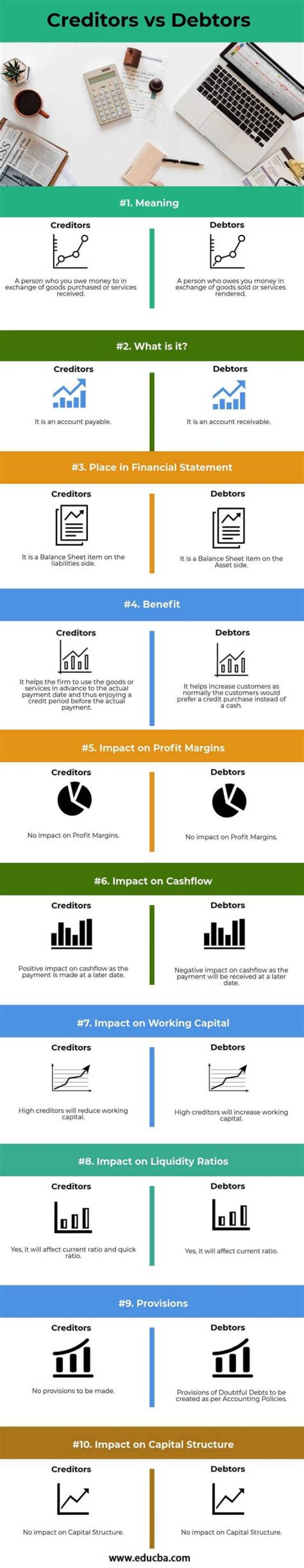 A creditor is an individual or business that has lent funds to a business and is owed money. A debtor is an individual or business who has borrowed funds from a business and so owes it money. There is a cost in borrowing funds.