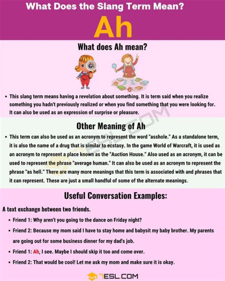What Does “Ah” Mean? This slang term means having a revelation about something. It is a term said when you realize something you hadn’t previously realized or when you find something that you were looking for. It can also be used as an expression of surprise or pleasure.