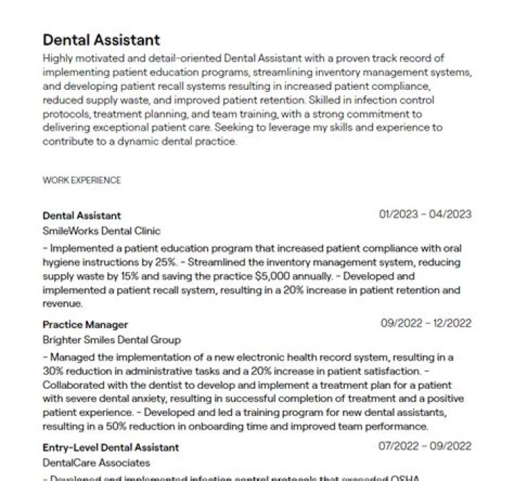 - Helping with infection control by sterilizing and disinfecting instruments, setting up instrument trays, preparing materials, and assisting with dental procedures.