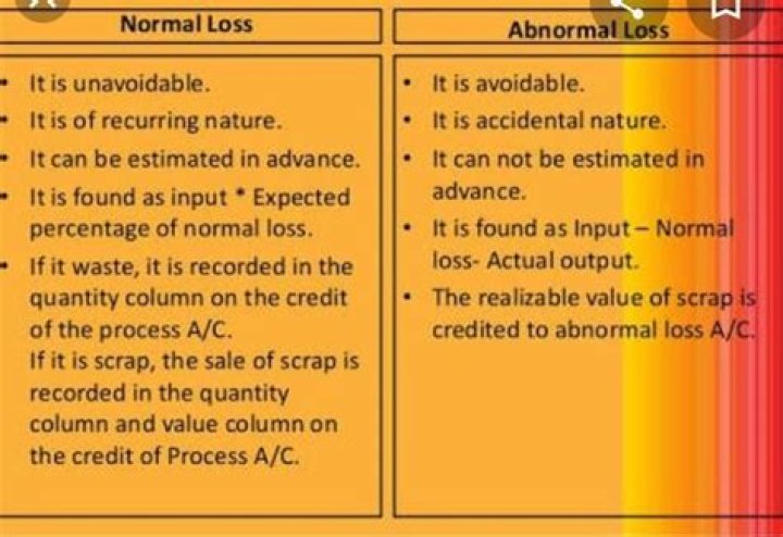 Normal Loss is any loss which is incurred during the normal course of operation in the process. Abnormal Loss is a loss which happens accidently. These are not of a recurring nature and are not incurred during the normal course of operation in the process.
