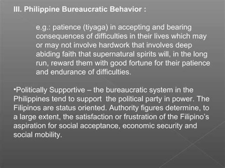 Philippine Bureaucratic Behavior :e.g.: patience (tiyaga) in accepting and bearingconsequences of difficulties in their lives which mayor may not involve hardwork that involves deepabiding faith that supernatural spirits will, in the longrun, reward them with good fortune for their patienceand endurance of difficulties …