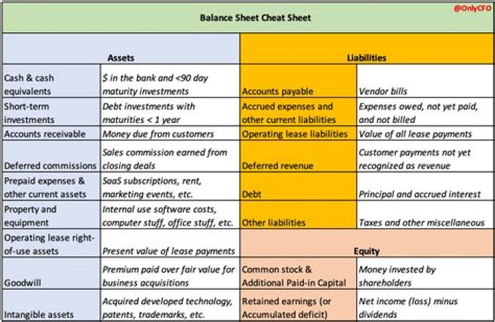 Typical line items included in the balance sheet (by general category) are: Assets: Cash, marketable securities, prepaid expenses, accounts receivable, inventory, and fixed assets. Liabilities: Accounts payable, accrued liabilities, customer prepayments, taxes payable, short-term debt, and long-term debt.